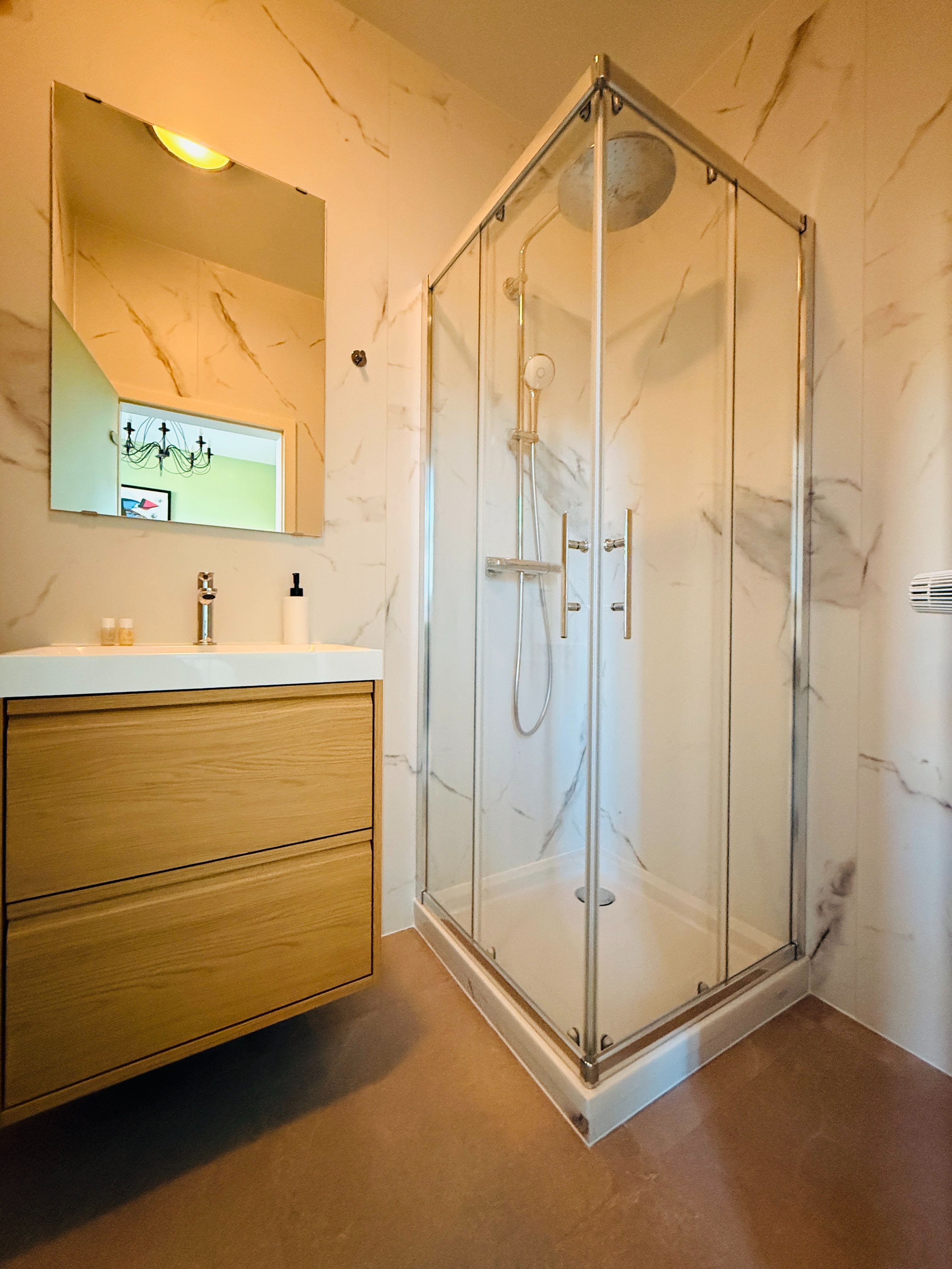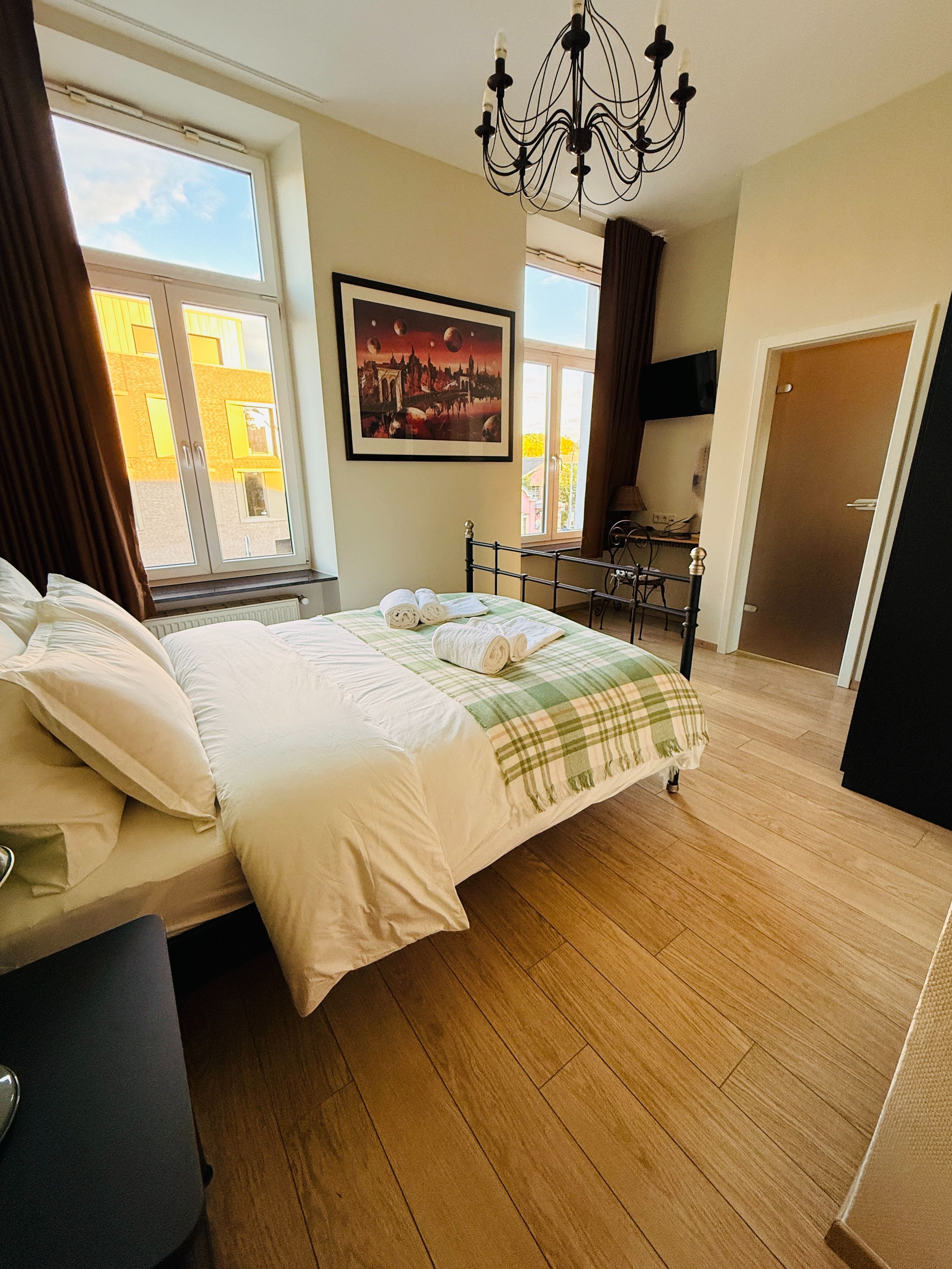 Une chambre élégante et apaisante, idéale pour savourer la fin de journée après un bon repas. Ses tons dorés et son ambiance tamisée invitent à la détente et à la rêverie.